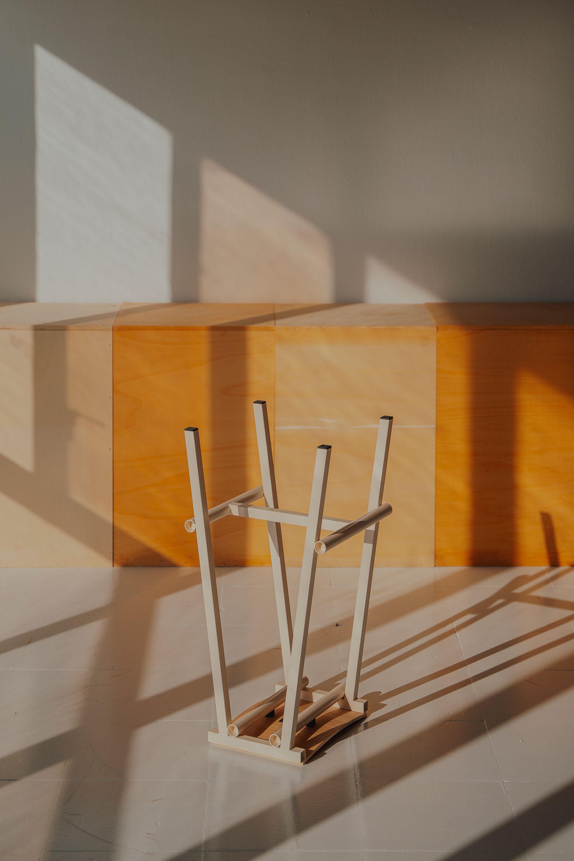 It features a simple metal structure made from standard sections, with just a piece of plywood serving as the seat. This plywood piece curves once it is placed in position under pressure. What I like most about this stool is that it would be difficult to change or remove anything from it, since it's been optimized to the fullest.