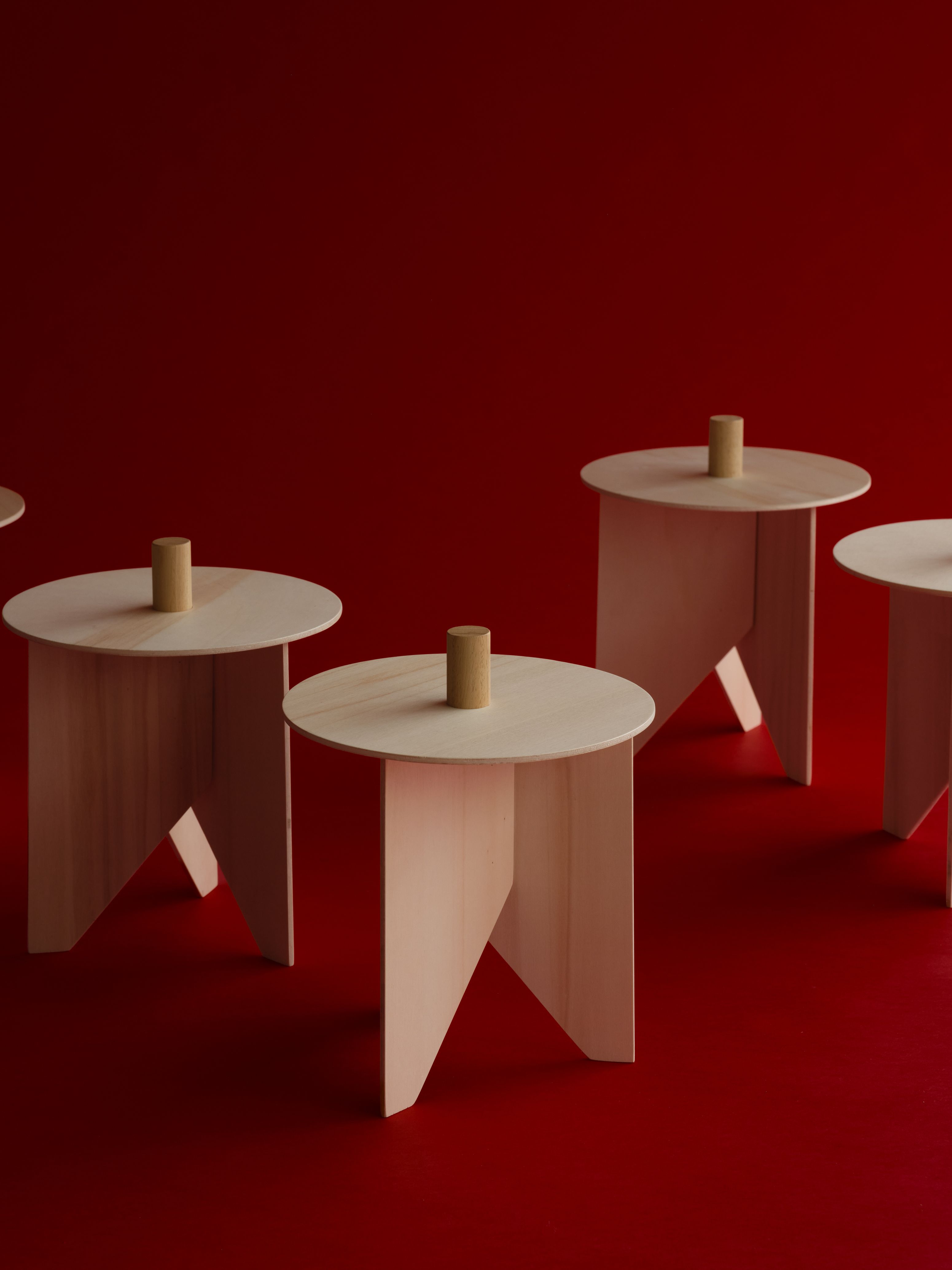 This version of Tripo is the lightest of all the models. It's more of a small table than a stool, made of poplar plywood and solid koto. The cylinder connects the entire structure, serves as a handle for easy carrying, and acts as a visual cue to discourage sitting on it.