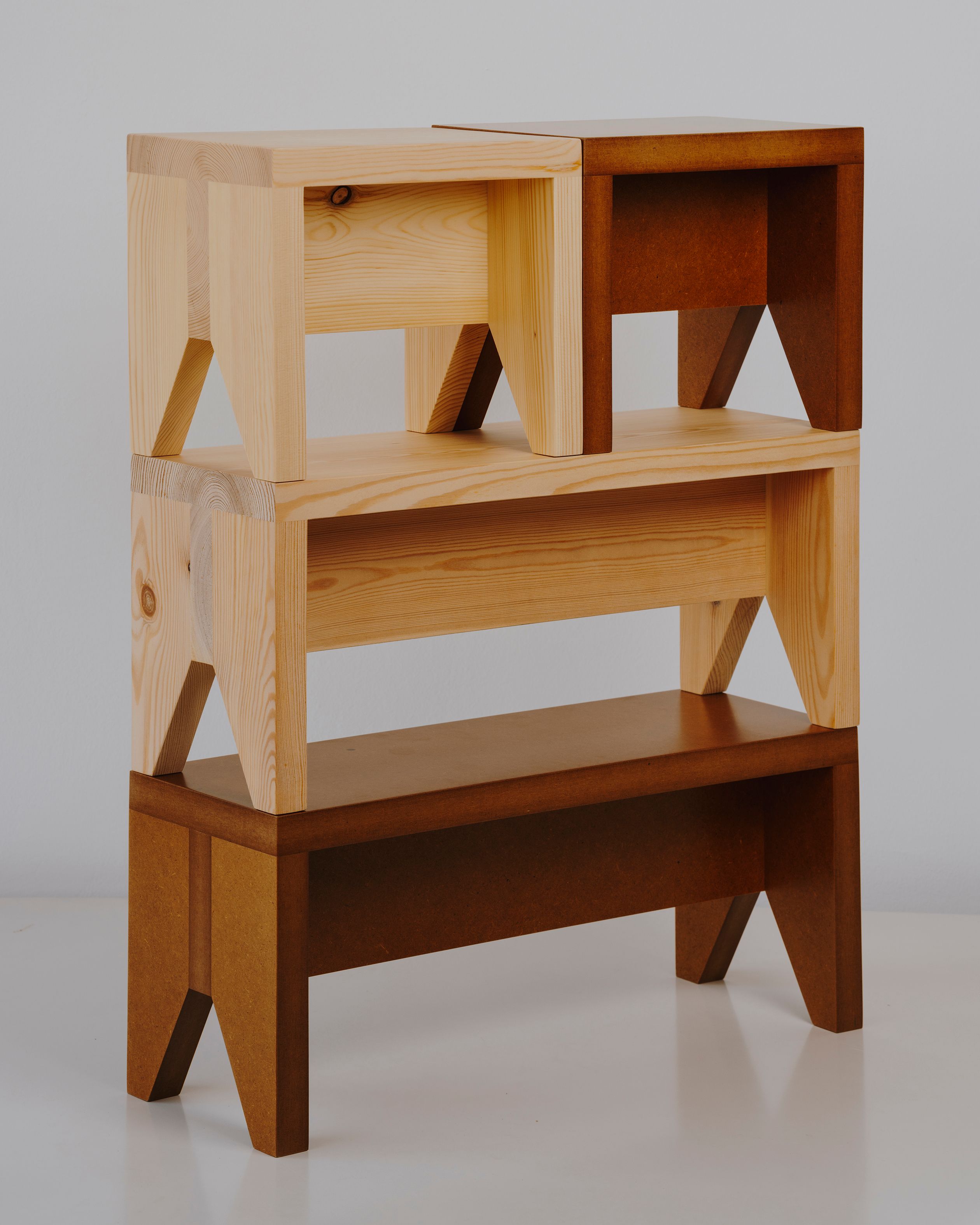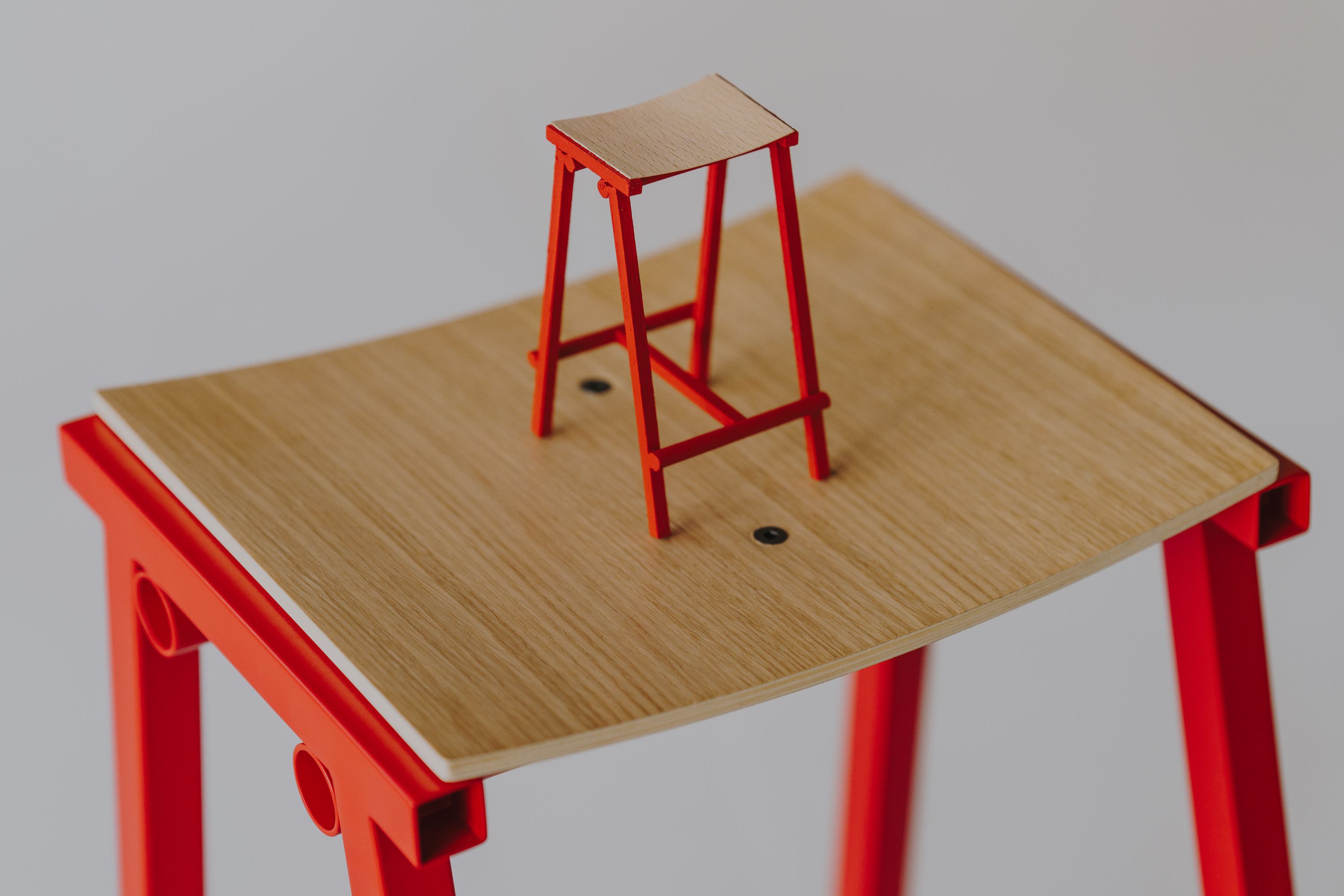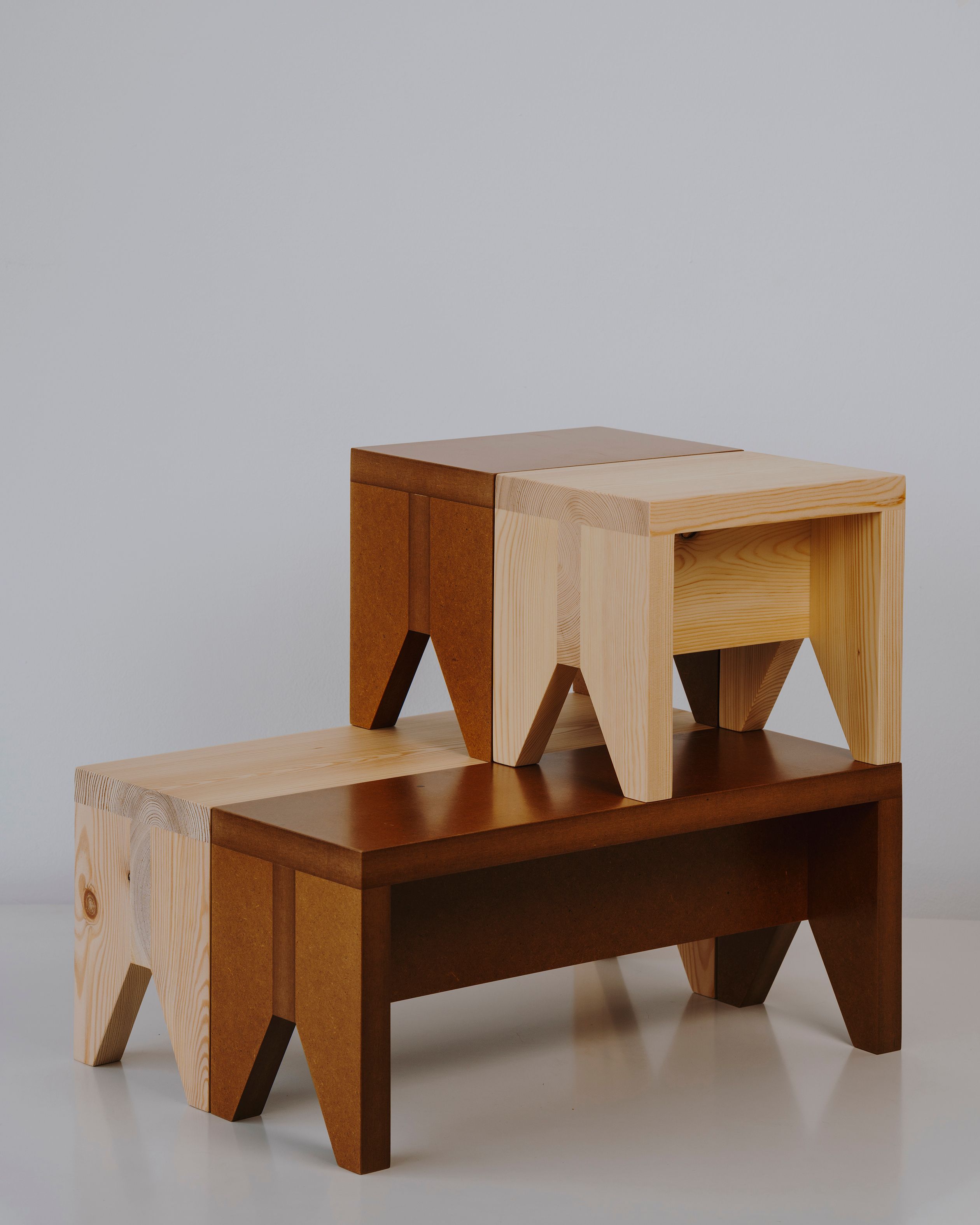 This version of Tripo is the lightest of all the models. It's more of a small table than a stool, made of poplar plywood and solid koto. The cylinder connects the entire structure, serves as a handle for easy carrying, and acts as a visual cue to discourage sitting on it.