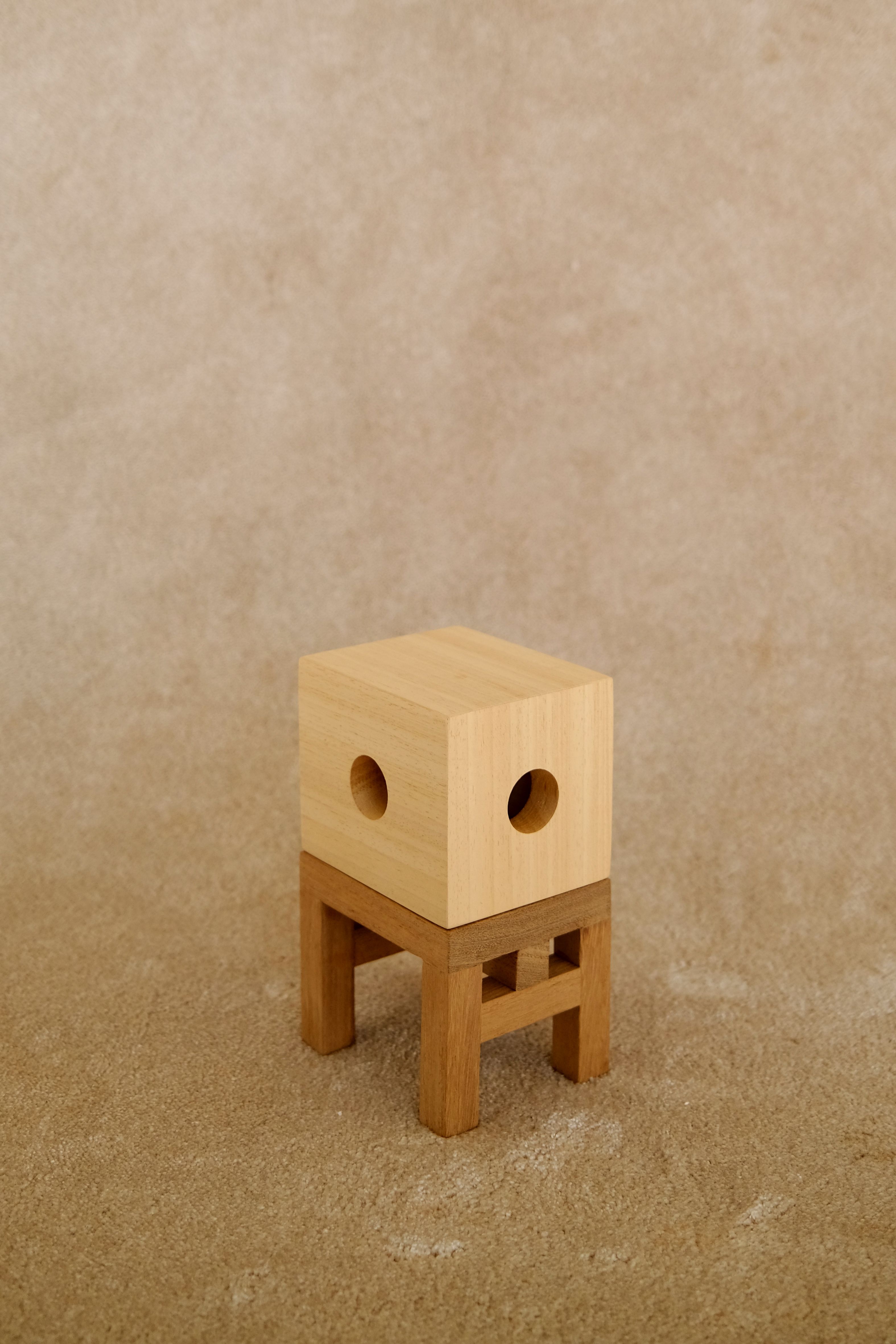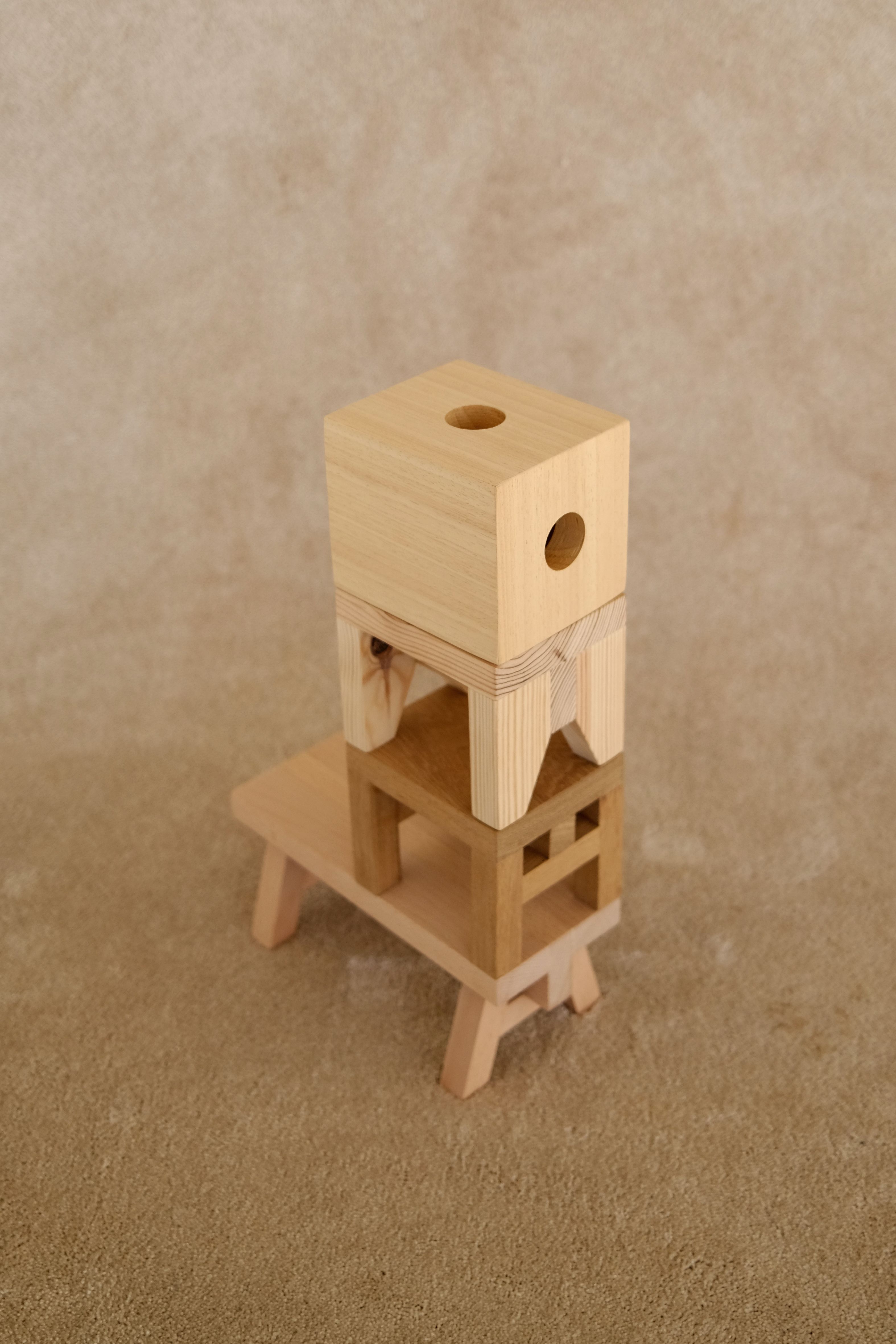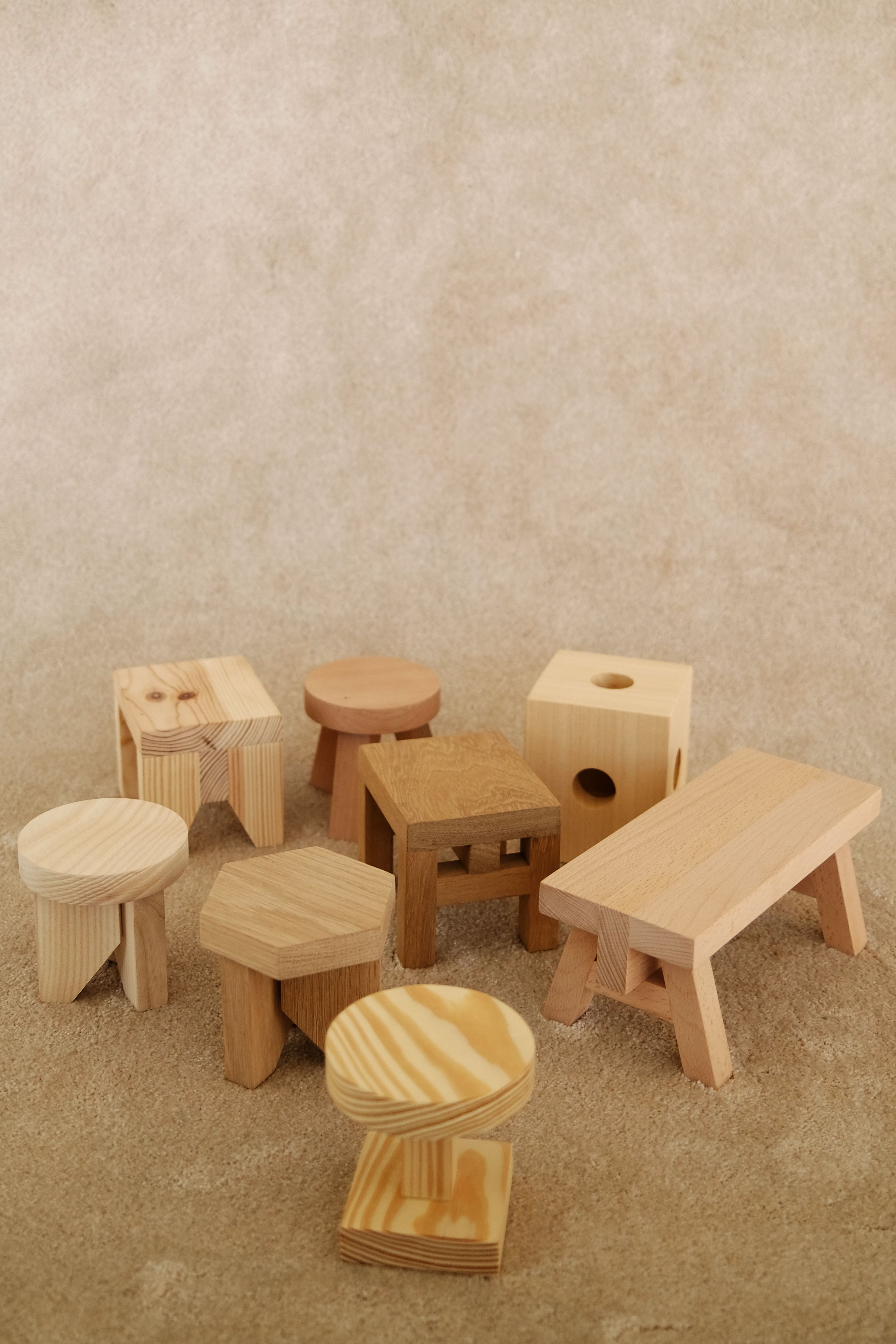 Joc de Tamborets is both a wood sample collection and a construction game. It consists of 8 scaled-down stools, each a caricature of its original design: including Manolito, Kamanar, Tripo, Taco, ATA and 3MO.