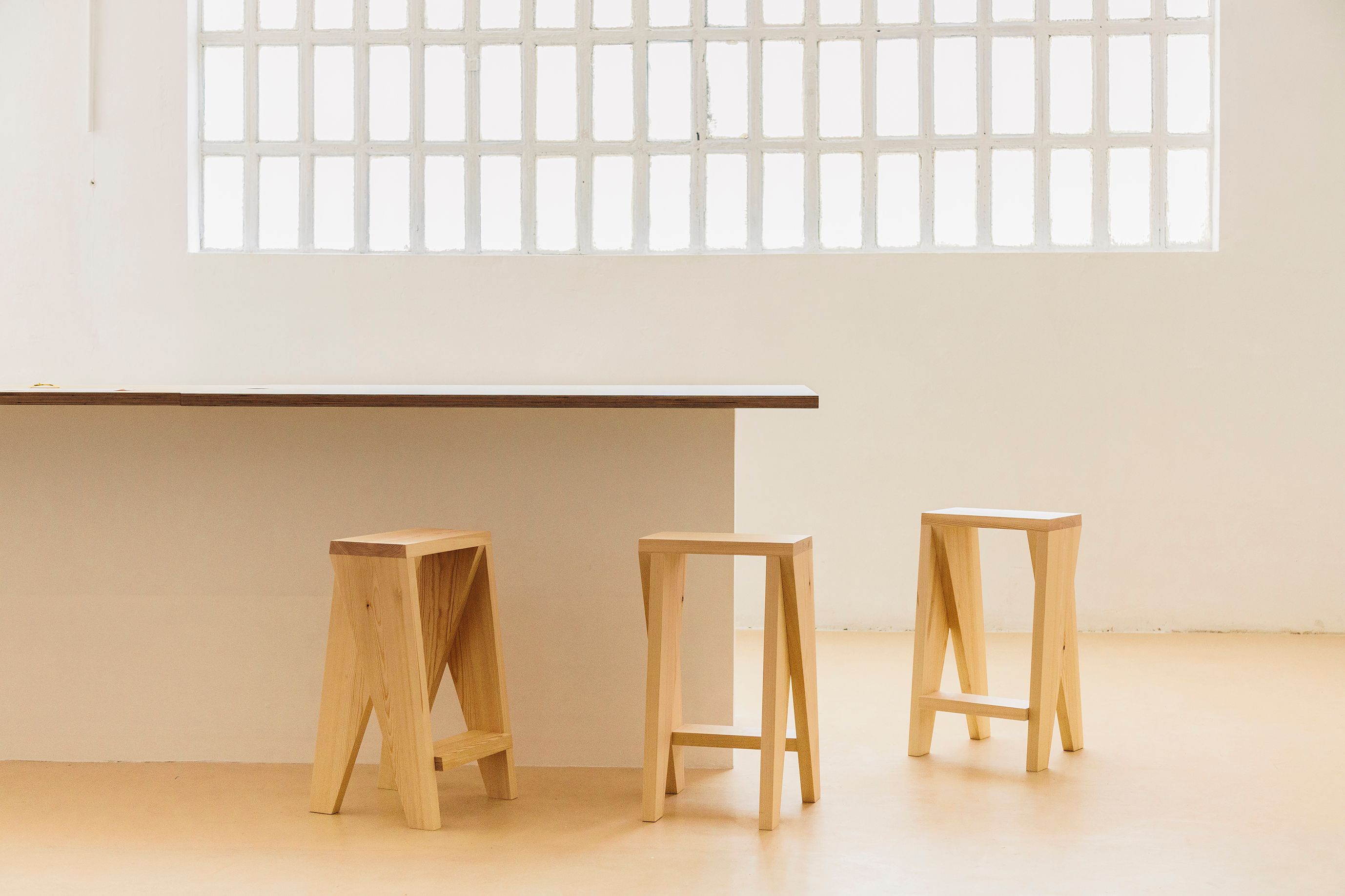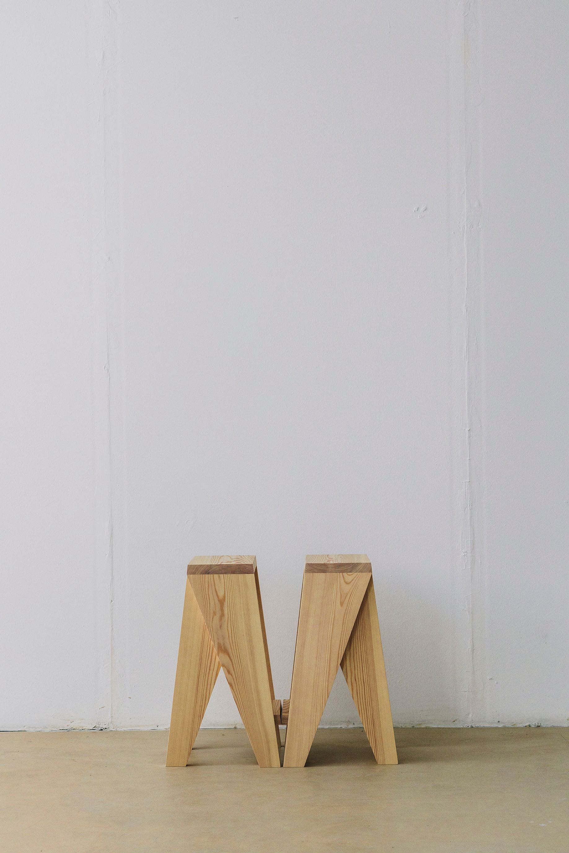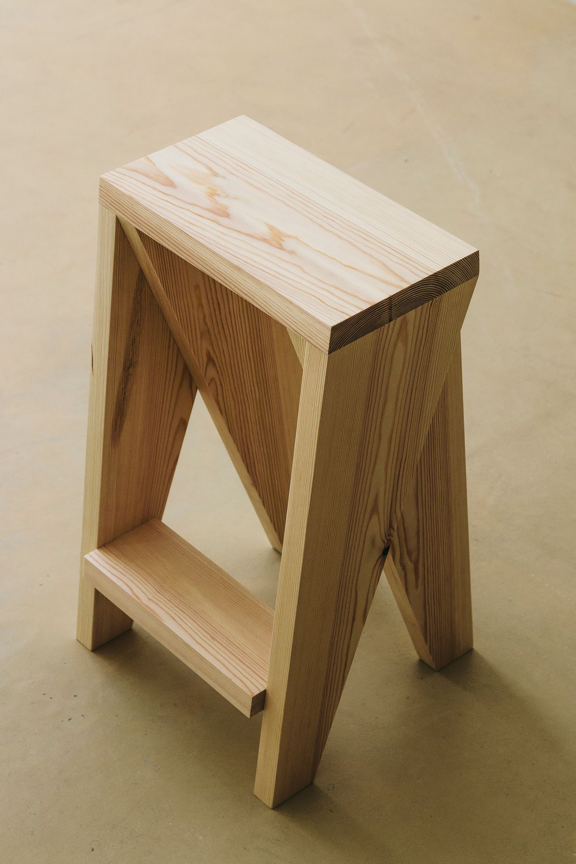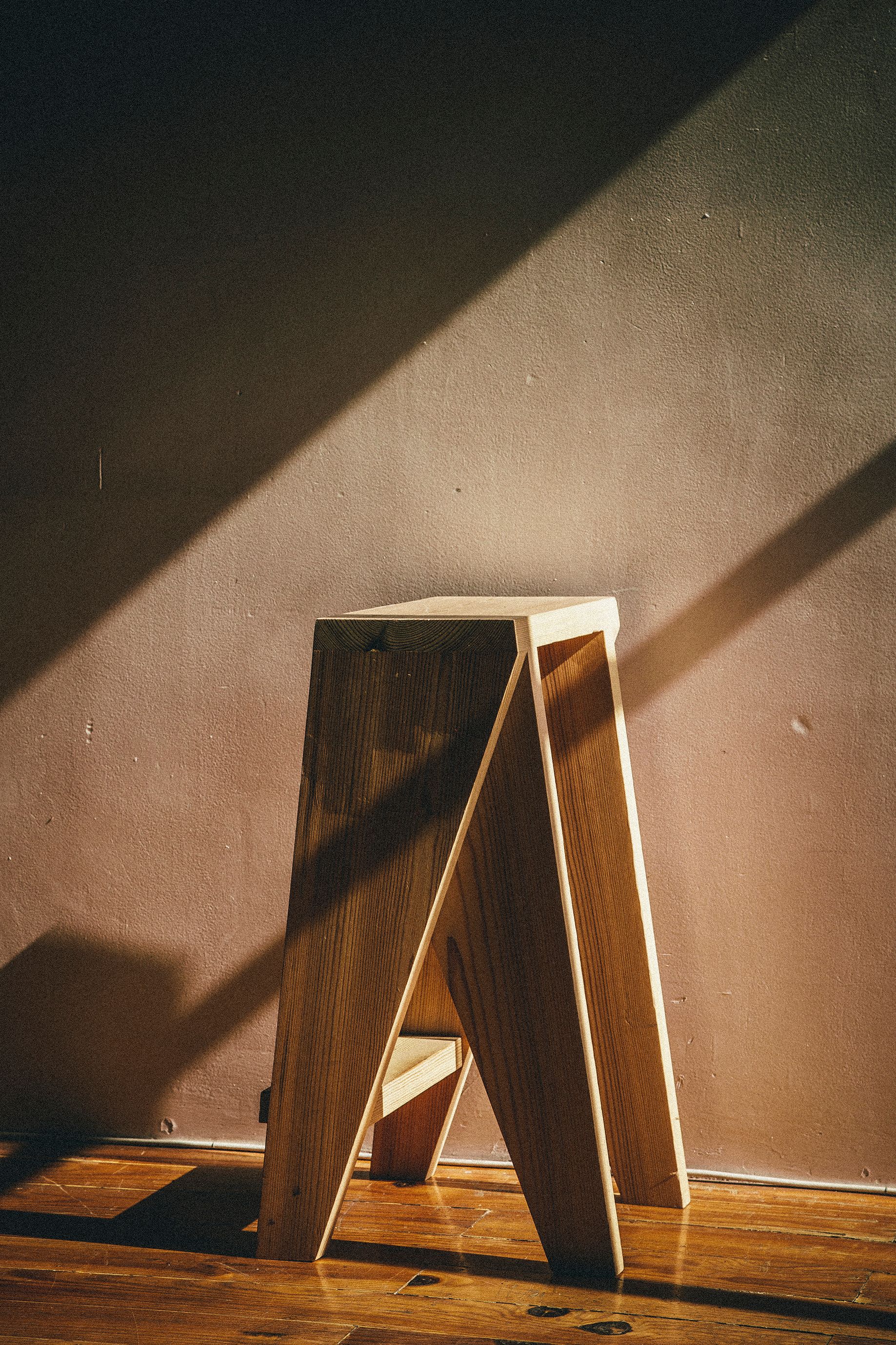 The result includes a pedestal with six different color finishes, a magical container that is red on the outside and black on the inside, a version of the Ikea Lack table but made of solid oak, a wedge-shaped bookshelf in solid iroko, a version of the Manolito stool in solid cherry, and a disproportionate die.