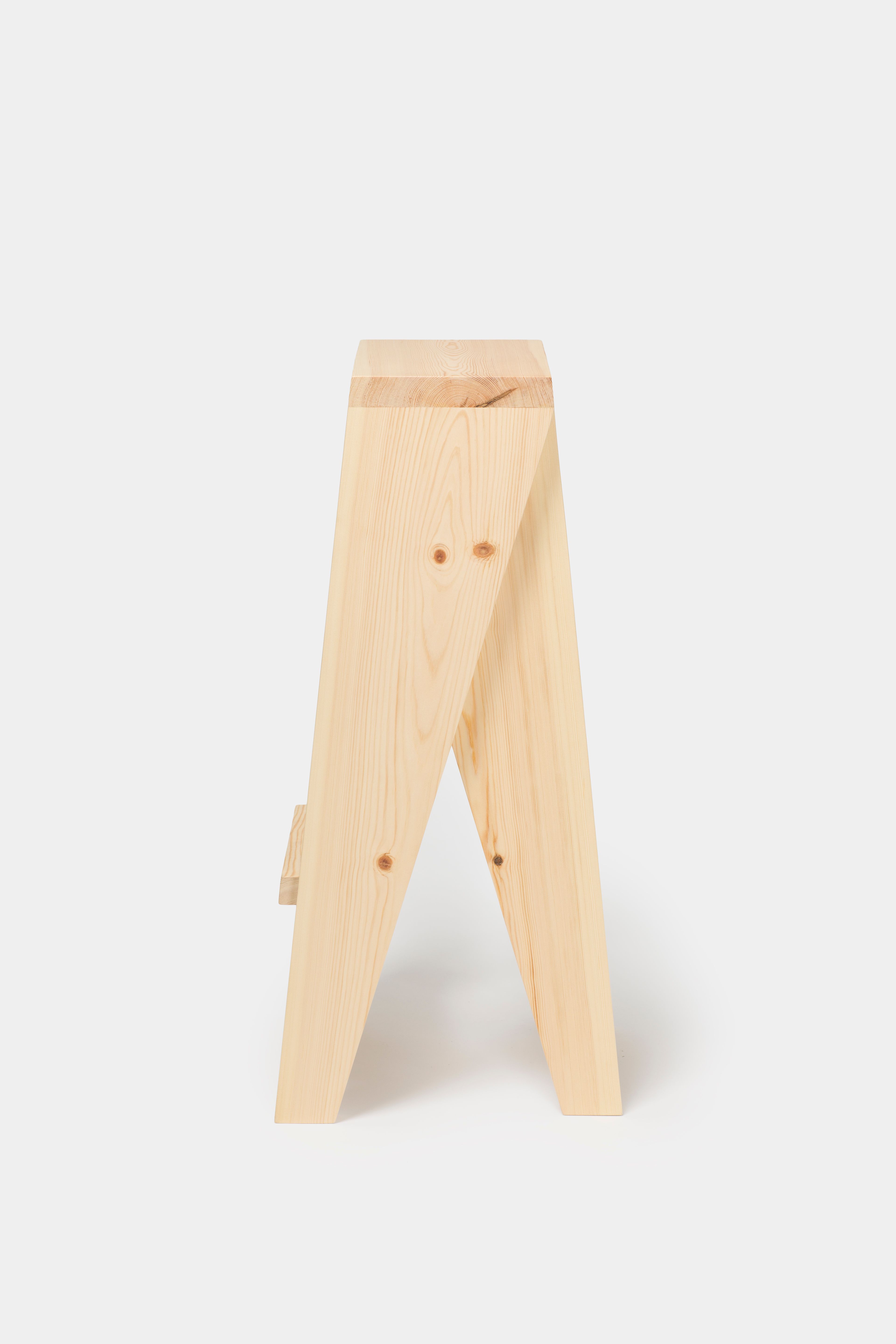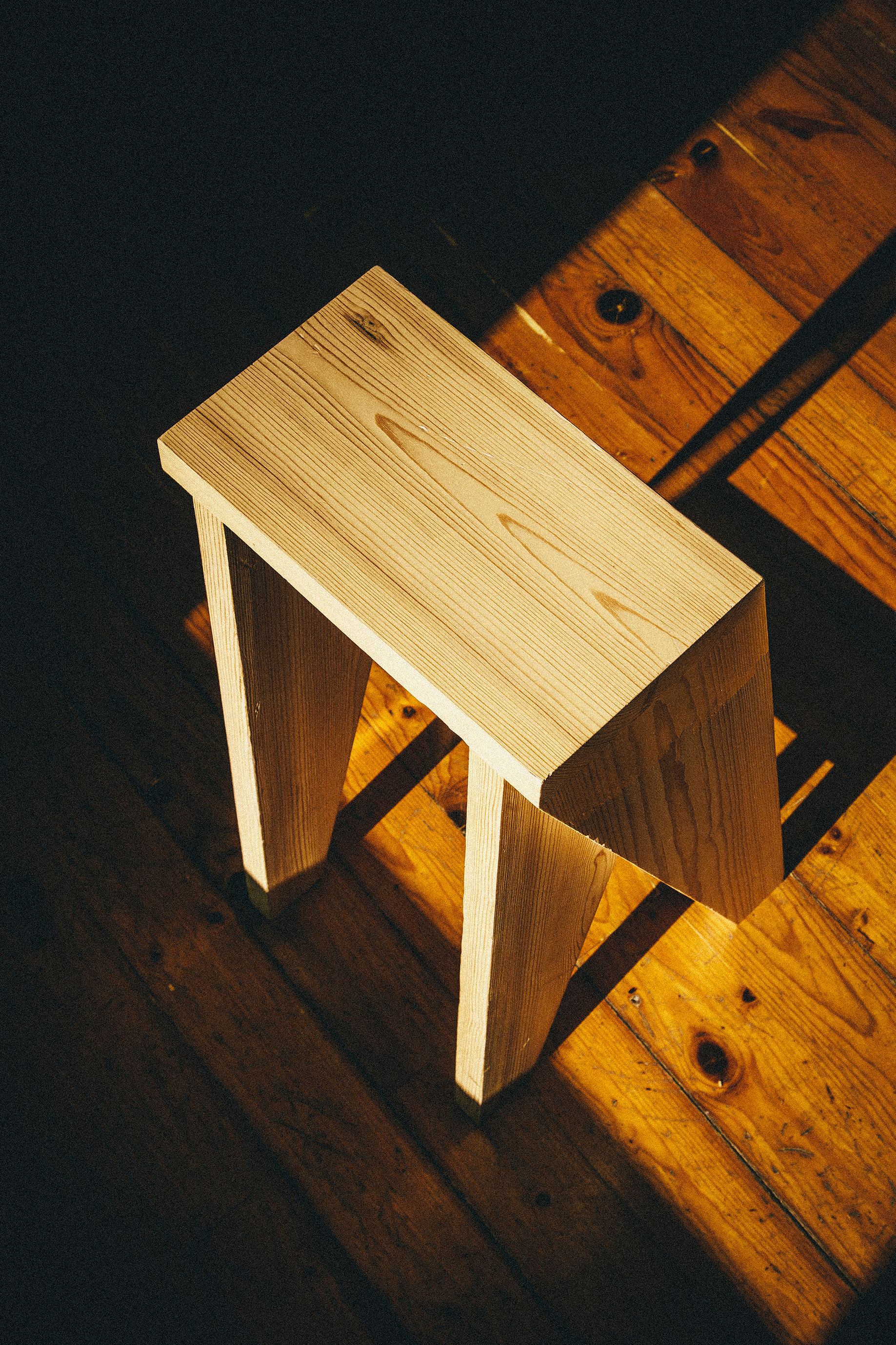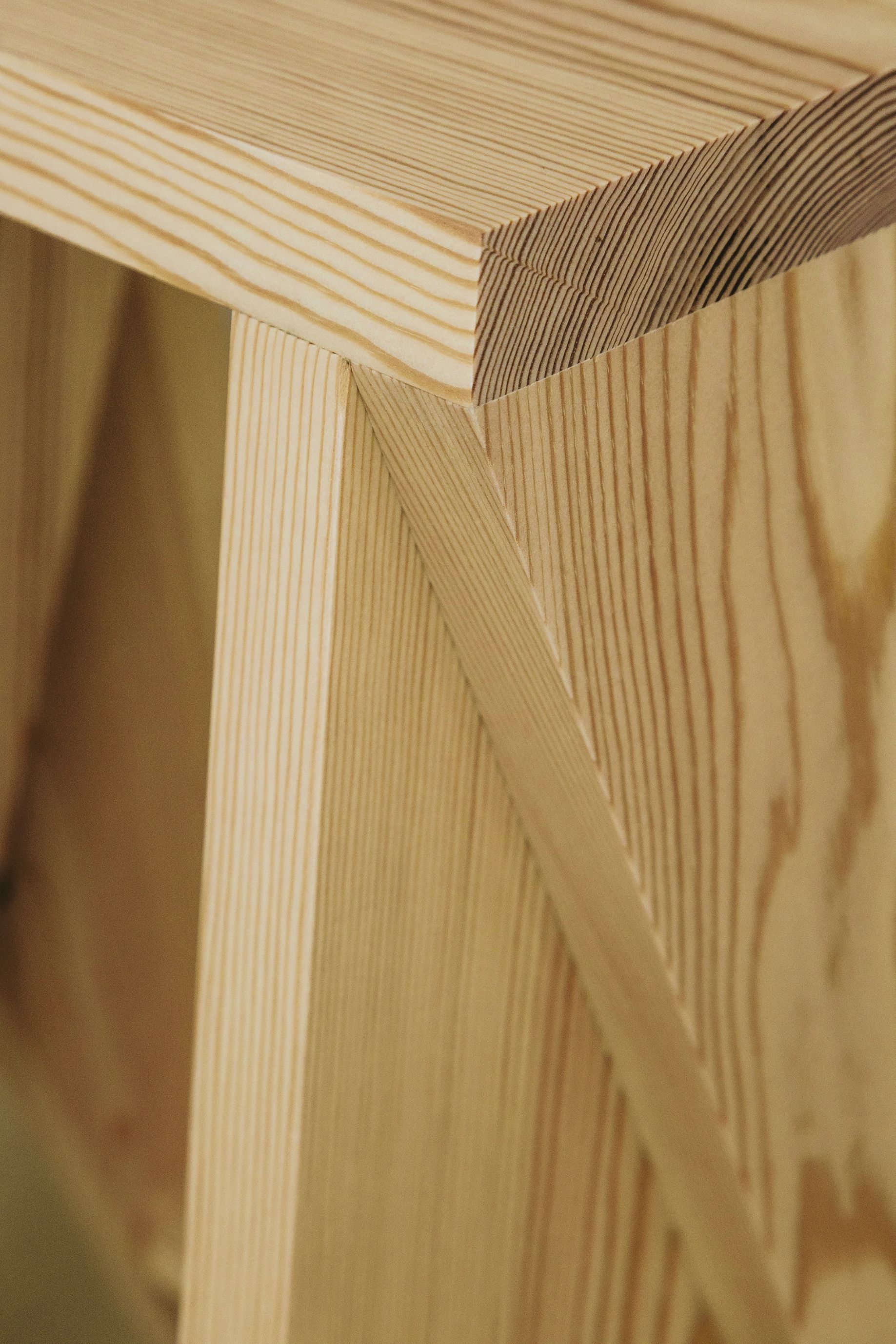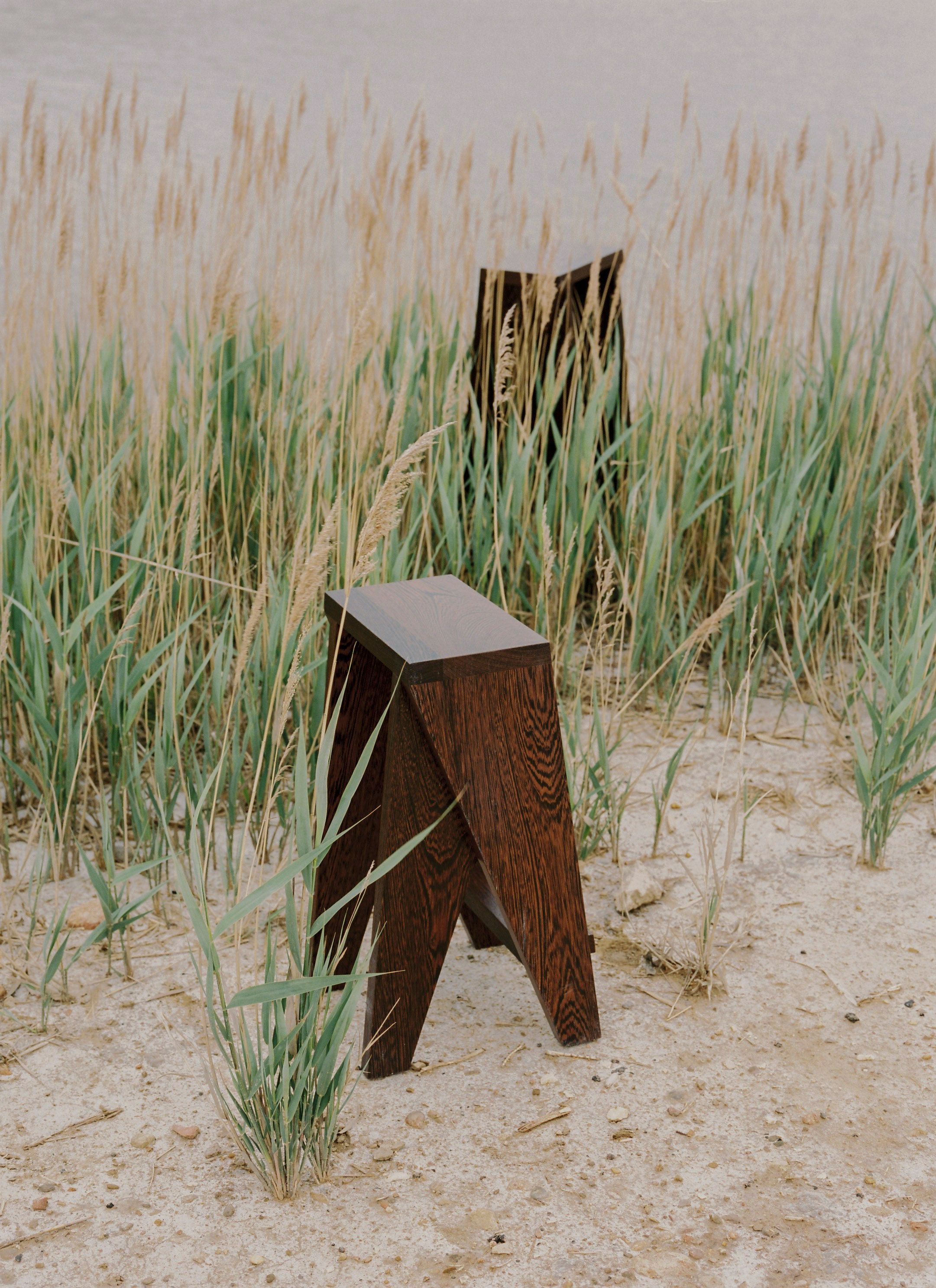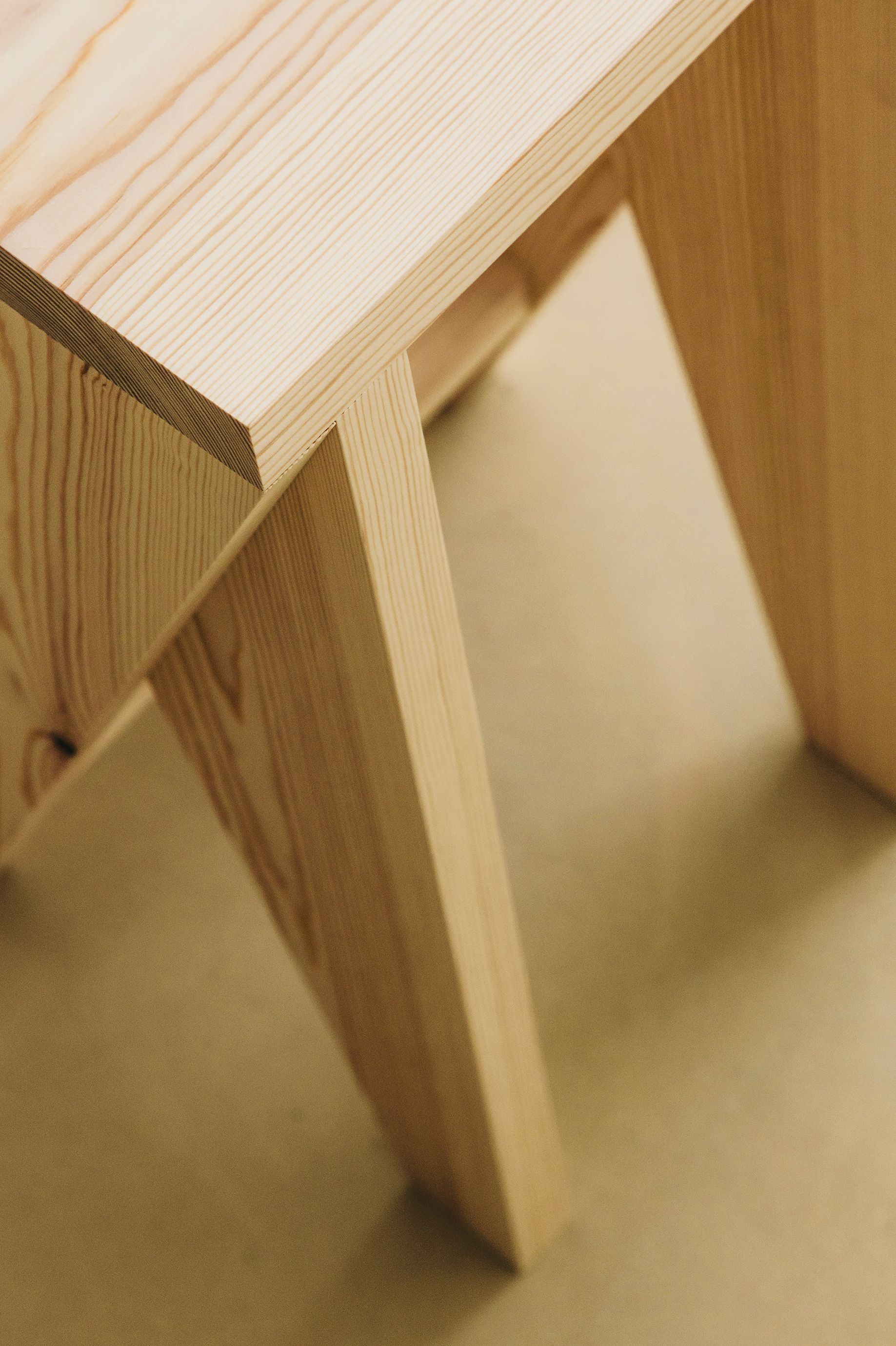 The result includes a pedestal with six different color finishes, a magical container that is red on the outside and black on the inside, a version of the Ikea Lack table but made of solid oak, a wedge-shaped bookshelf in solid iroko, a version of the Manolito stool in solid cherry, and a disproportionate die.