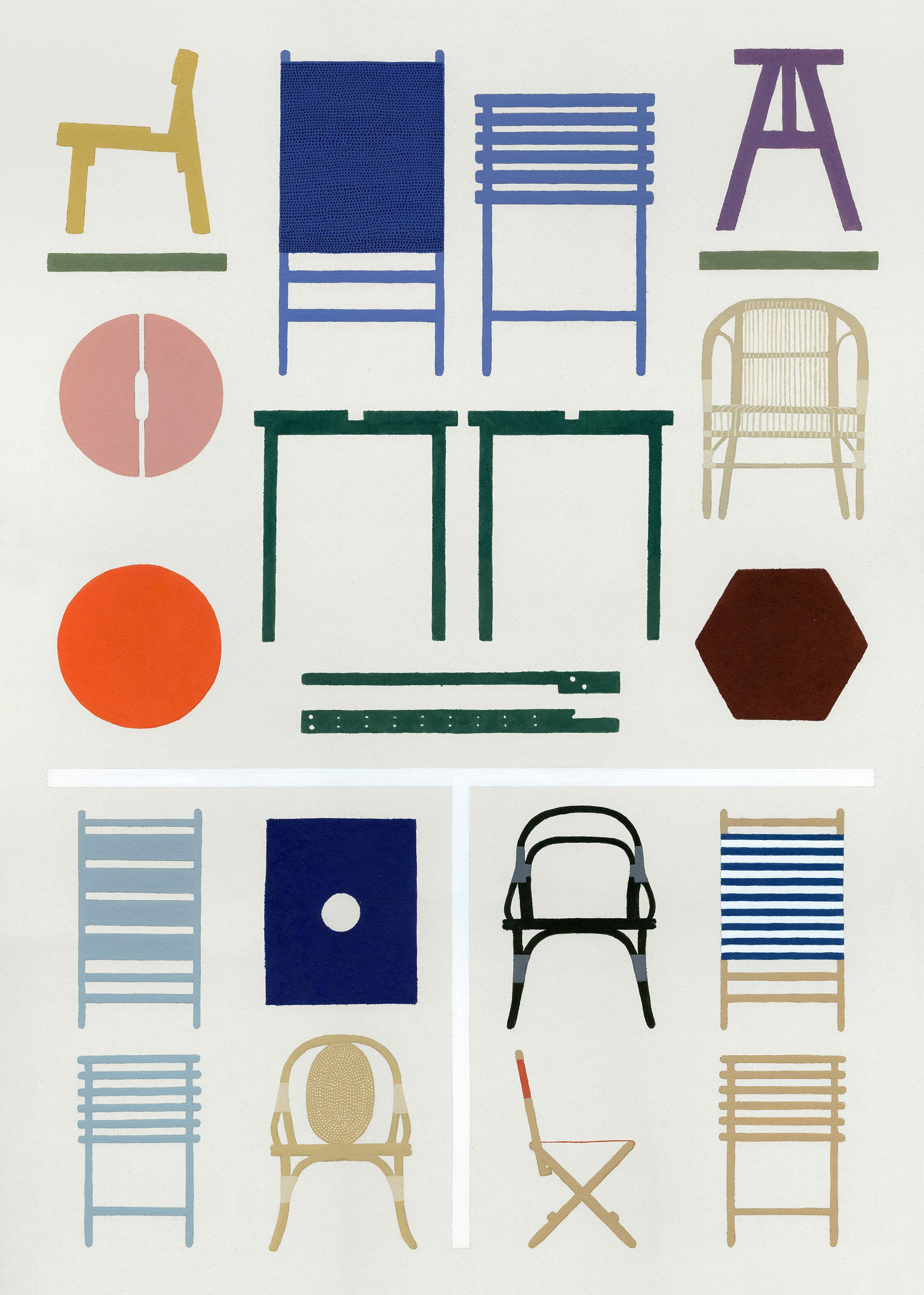 Each chair is painted in more than one color to emphasize the meaning of each when contrasted with the others.