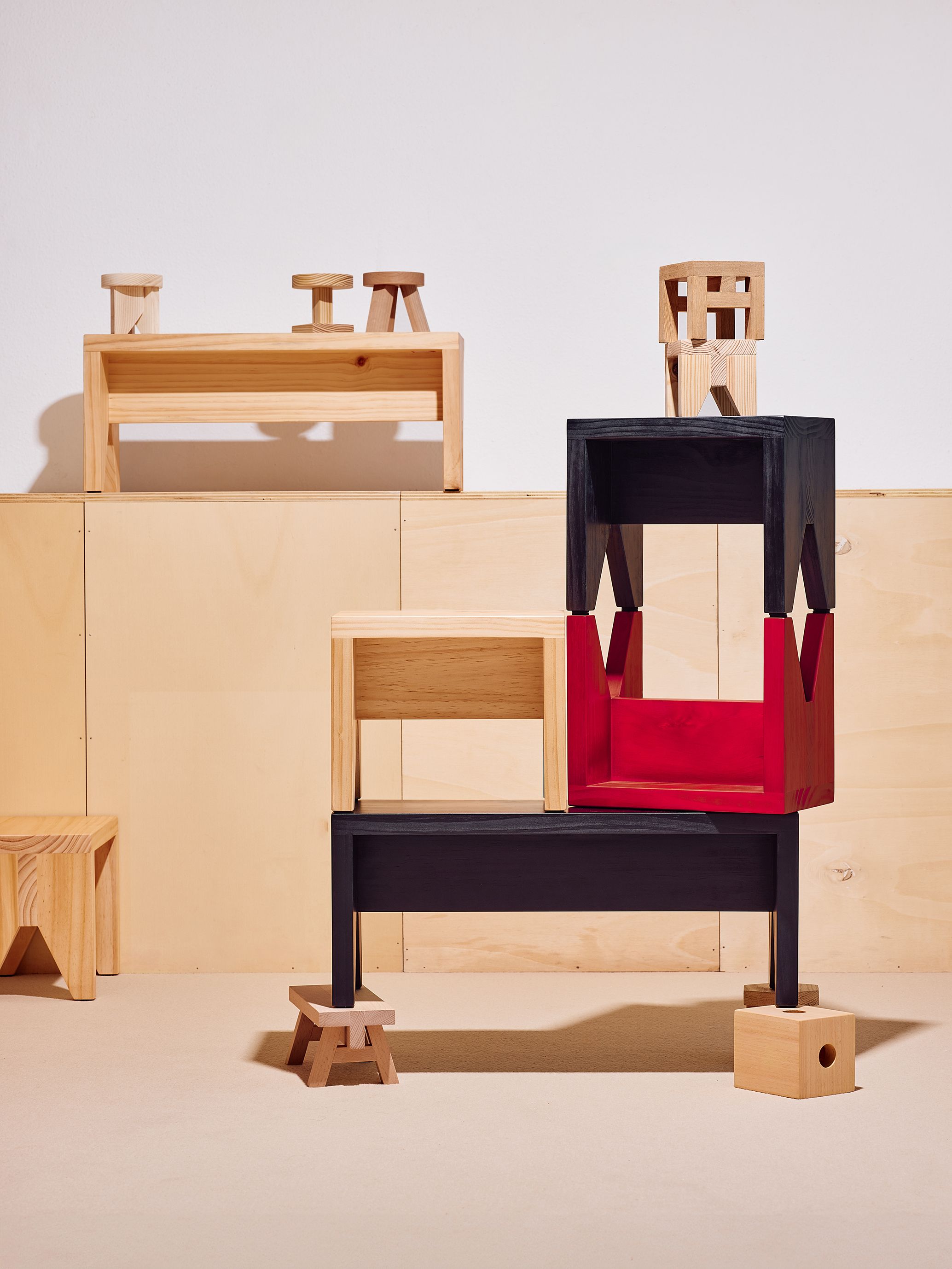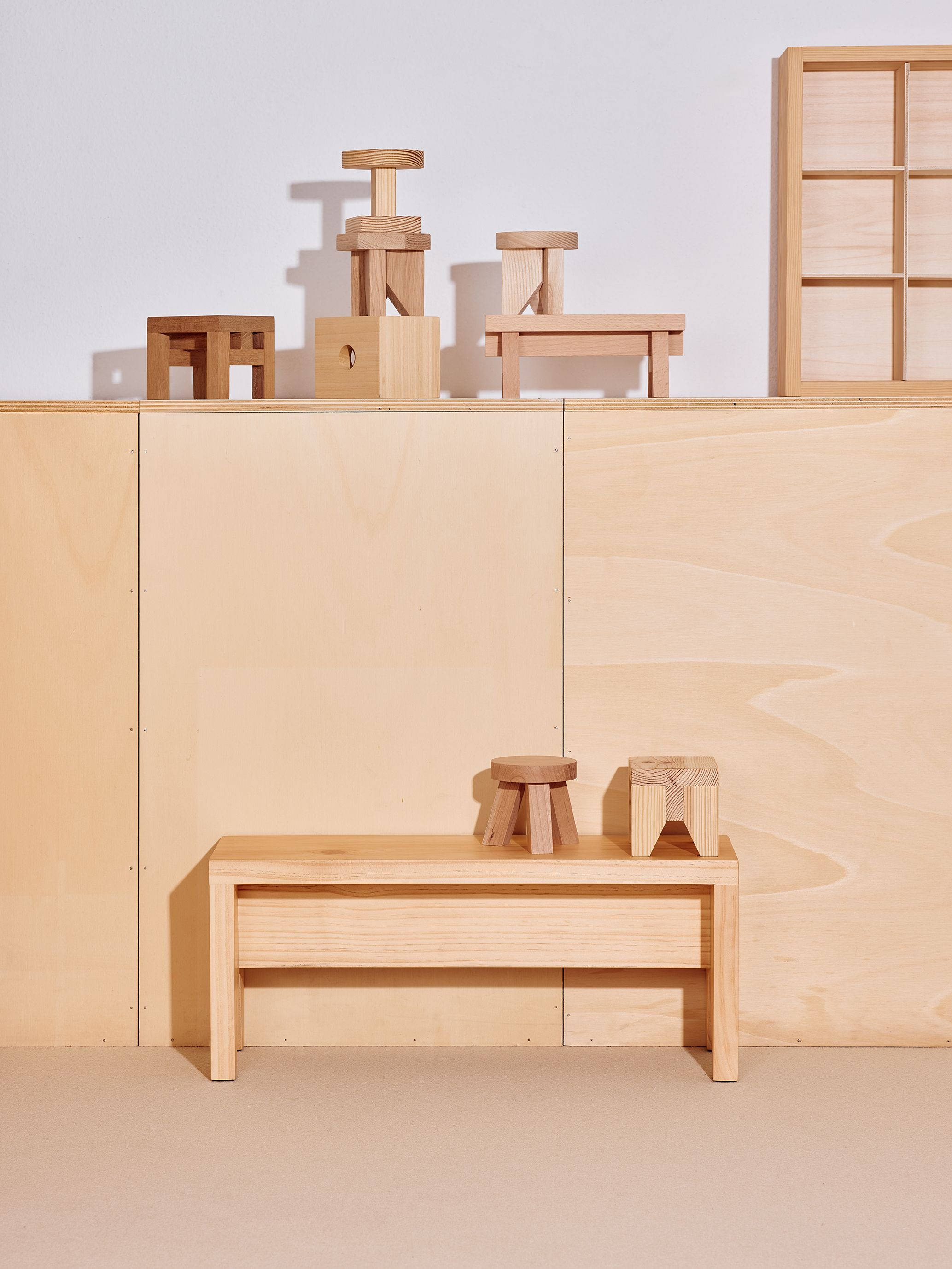 Joc de Tamborets is both a wood sample collection and a construction game. It consists of 8 scaled-down stools, each a caricature of its original design: including Manolito, Kamanar, Tripo, Taco, ATA and 3MO.