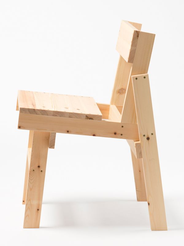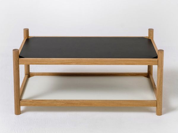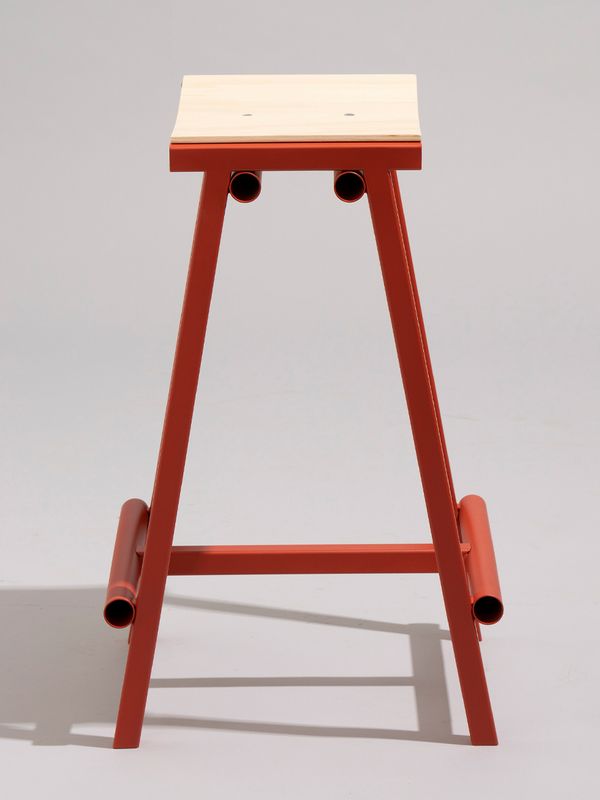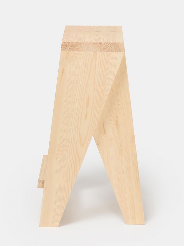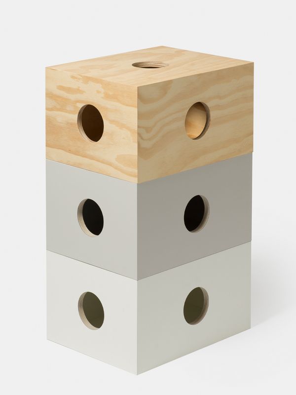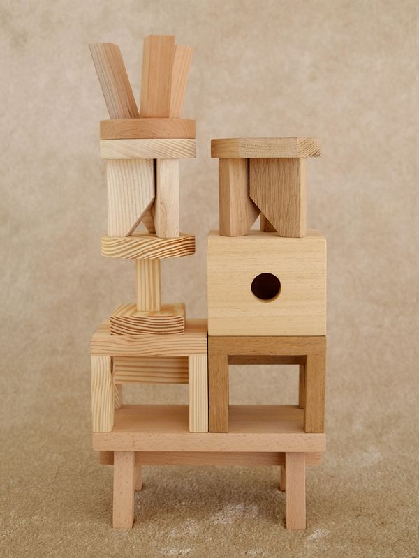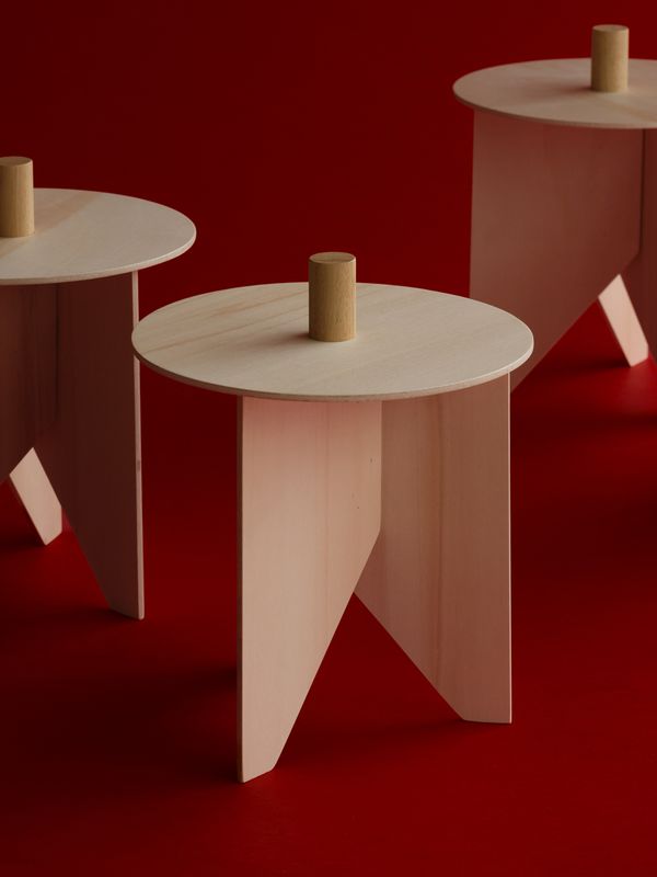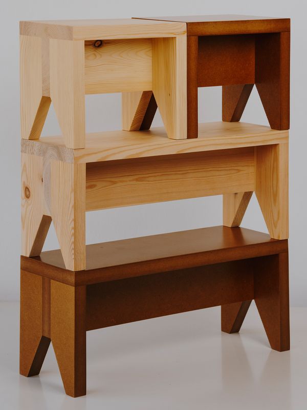 The result includes a pedestal with six different color finishes, a magical container that is red on the outside and black on the inside, a version of the Ikea Lack table but made of solid oak, a wedge-shaped bookshelf in solid iroko, a version of the Manolito stool in solid cherry, and a disproportionate die.