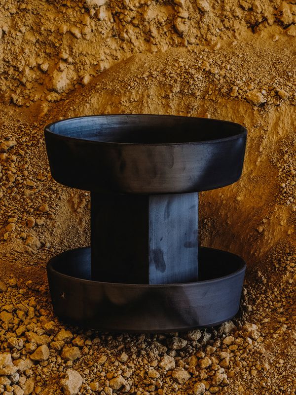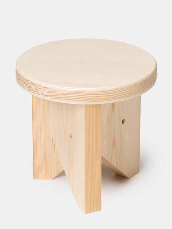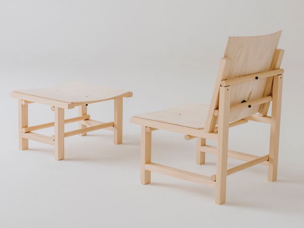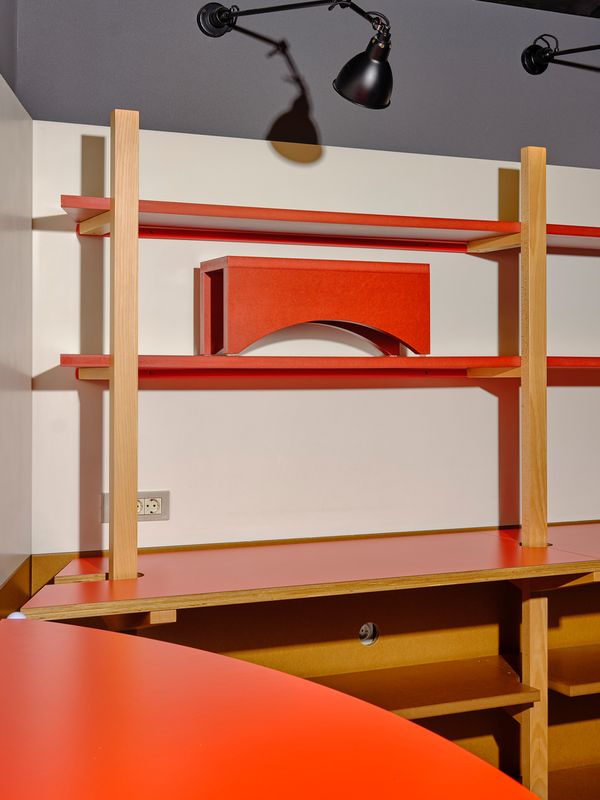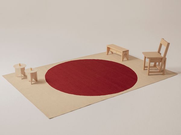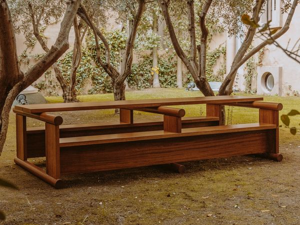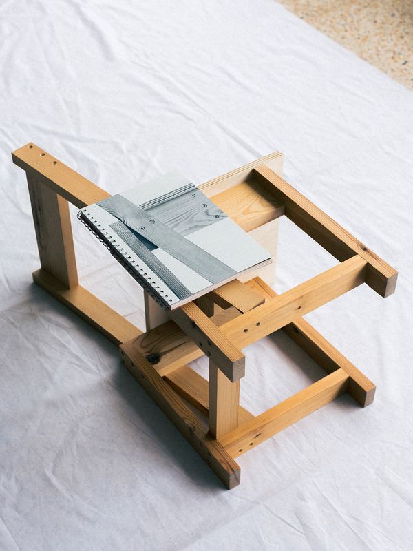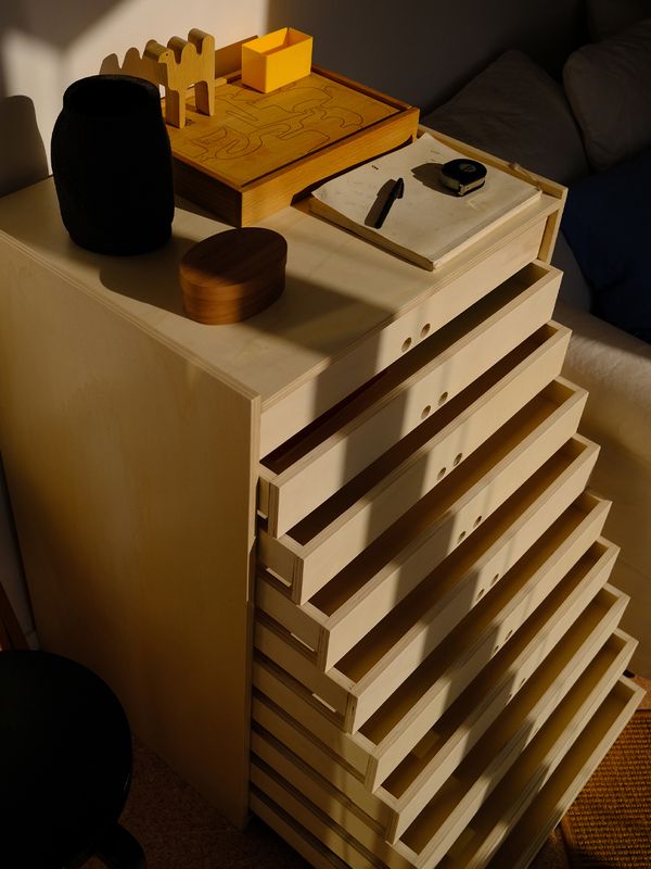 The result includes a pedestal with six different color finishes, a magical container that is red on the outside and black on the inside, a version of the Ikea Lack table but made of solid oak, a wedge-shaped bookshelf in solid iroko, a version of the Manolito stool in solid cherry, and a disproportionate die.